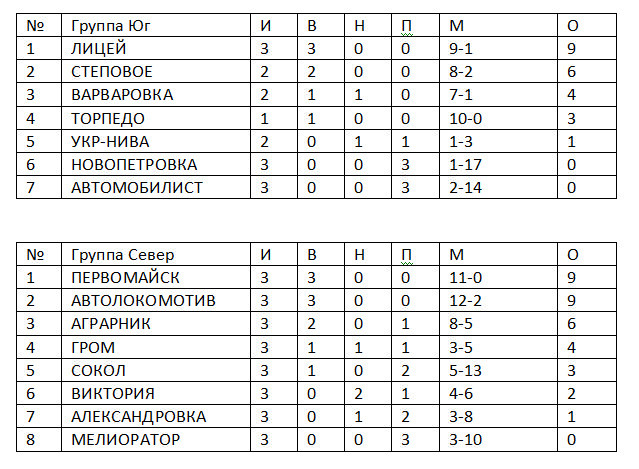 Турнірні таблиці груп "Південь", "Північ"(взяті з сайту Миколаївський футбол):